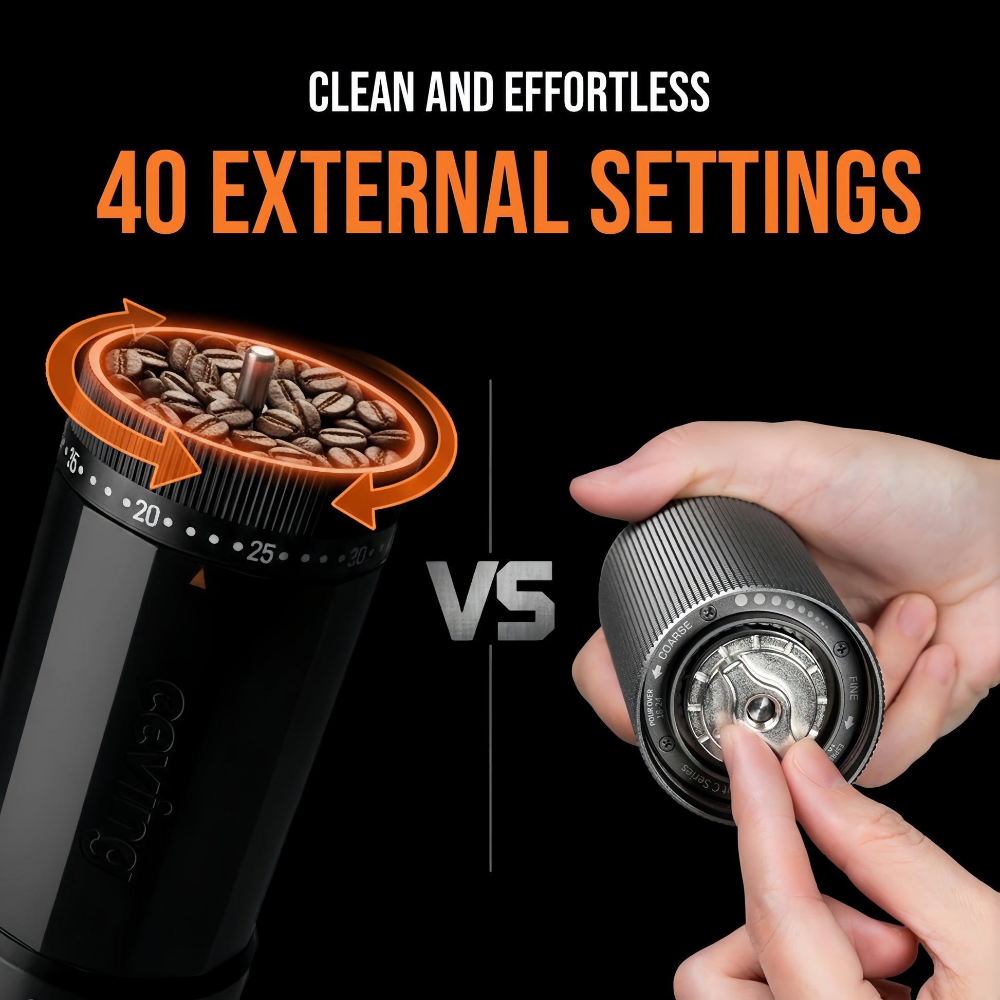 - 40 External Grind Settings – Dial in your perfect brew in seconds and say goodbye to dirty hands